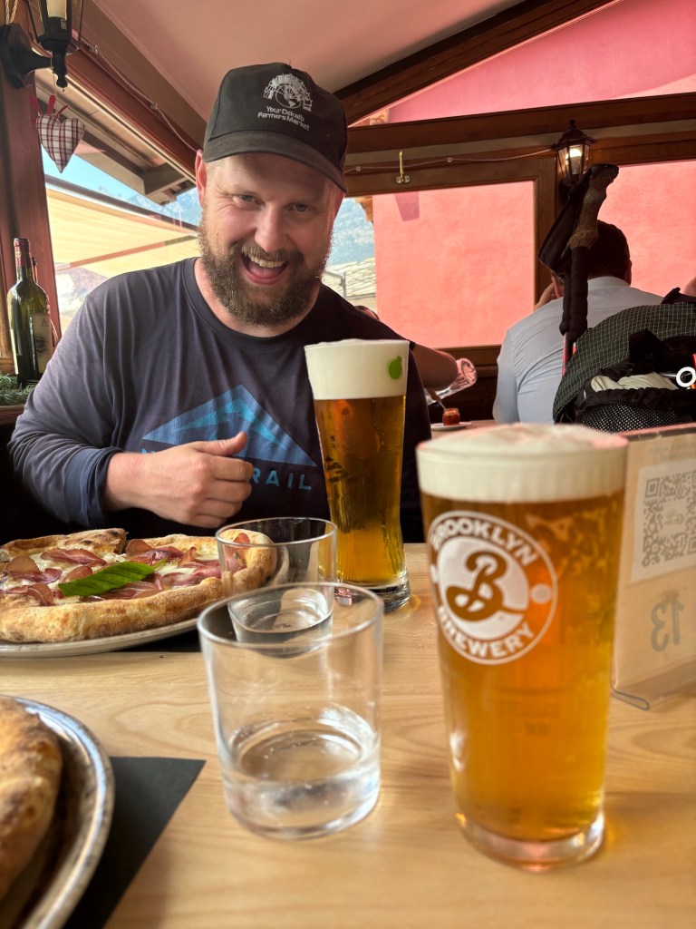 After an exhausting day of hiking, we ate lunch at a pizzeria to refuel and headed toward a church in the town of Verres where we hoped to find a bed. On the way up to the church (pictured below) we ran into Pascal and Speedy enjoying lunch at a picnic table at the foot of the hill. With a shrug of the shoulders Pascal explains that the church isn’t taking guests or signing trail passports at the moment because the priest is injured.
