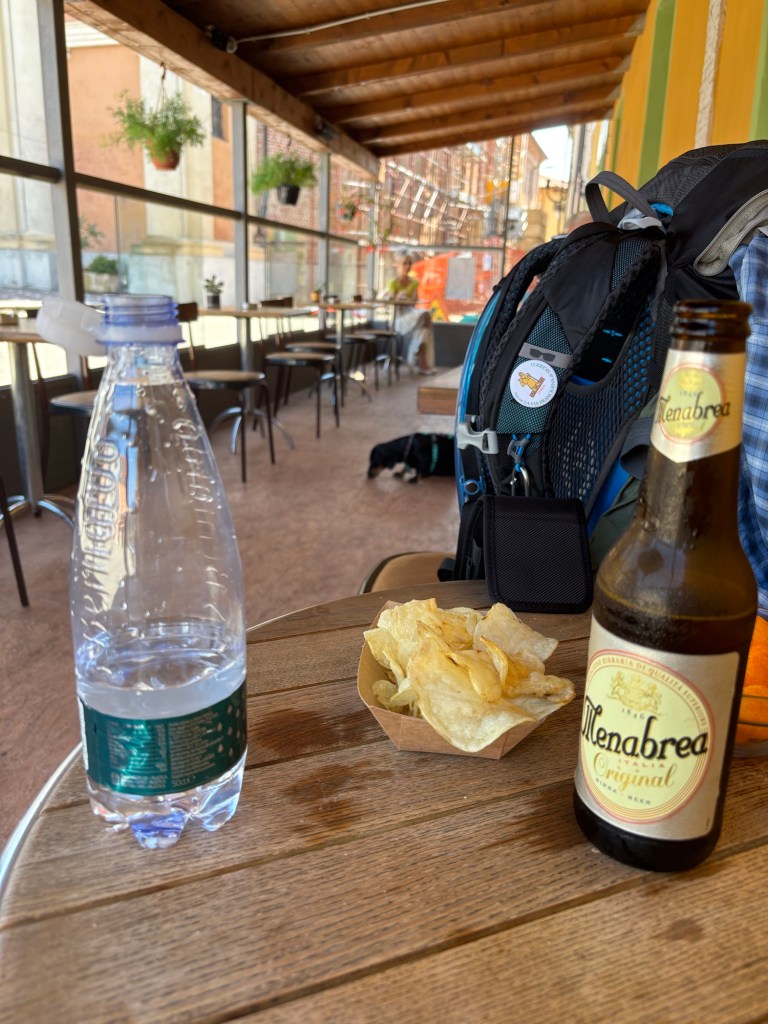 After more than 10 hours of hiking I arrived at my destination for the day: Vercelli. I arrived exhausted after having consumed my “backup/reserve” food supply and beginning to dip into my “backup/reserve” water supply. The 19km from San Germano Vercellese were almost devoid of services (food and water) and even the services in San Germano Vercellese were scant (see below my lunch of potato chips, cheese puffs and beer). My cappuccino and croissant in Santhia would fuel me for the day until I pulled out my backup/reserve snack bar about 5km outside Vercelli.