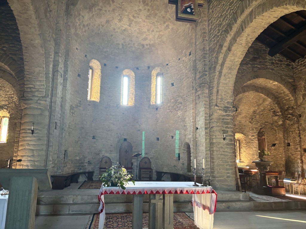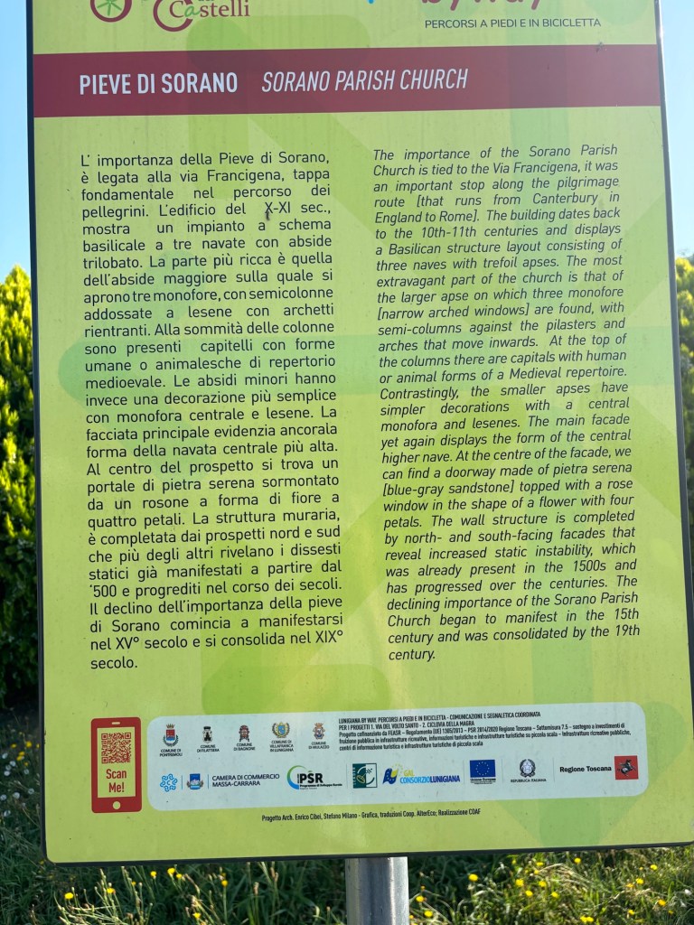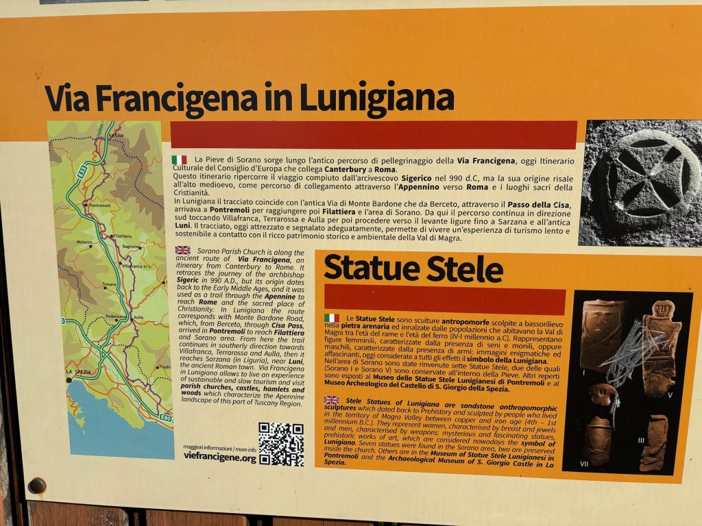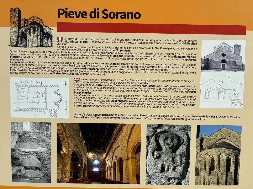Around 8:15 a.m., Ignatio decides we’ve waited long enough for a coffee (& cigarette) and approaches me with an off the trail option for a cafe’ (we’d agreed to hit the next town with a cafe’/bar, Filetto, around 10:45). Good with me. I follow him not far (5 minutes) down a highway and we strike pay dirt – coffee. After our coffees and snacks, we’re back on the trail by 8:45. Just after 9:00 a.m., we roll into Filattiera and enjoy visiting Santo Stefano Romanesque Parish Church which is a place of significant architectural interest in this region due to its well restored Romanesque architecture. Based upon archaeological findings here, it is believed a structure was in place here in the 4th-1st millennium B.C.