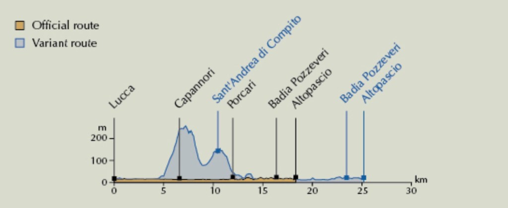The “shortcut” route recommended in the guidebook delivers beautiful views back over Lucca but at times also offers very overgrown and a somewhat treacherous descent.